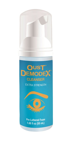Oust™ Demodex Cleanser is an extra strength foaming cleanser with tea tree oil that effectively relieves irritation from the eyelashes, eyelids, brow and face and aids in the removal of adult Demodex mites and their offspring when used daily. It also contains a moisturizer and preservative blend that offers anti-bacterial properties.